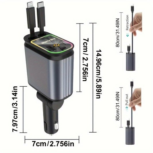 66W 4-in-1 Retractable Car Charger With Star Projector | Color Breathing Light, Fast Car Phone Charger With Lightning/TypeC, 2 USB Port Adapters, Compatible With IPhone 15/14/13/12/11, Galaxy, Pixel For IOS/Android Devices Co